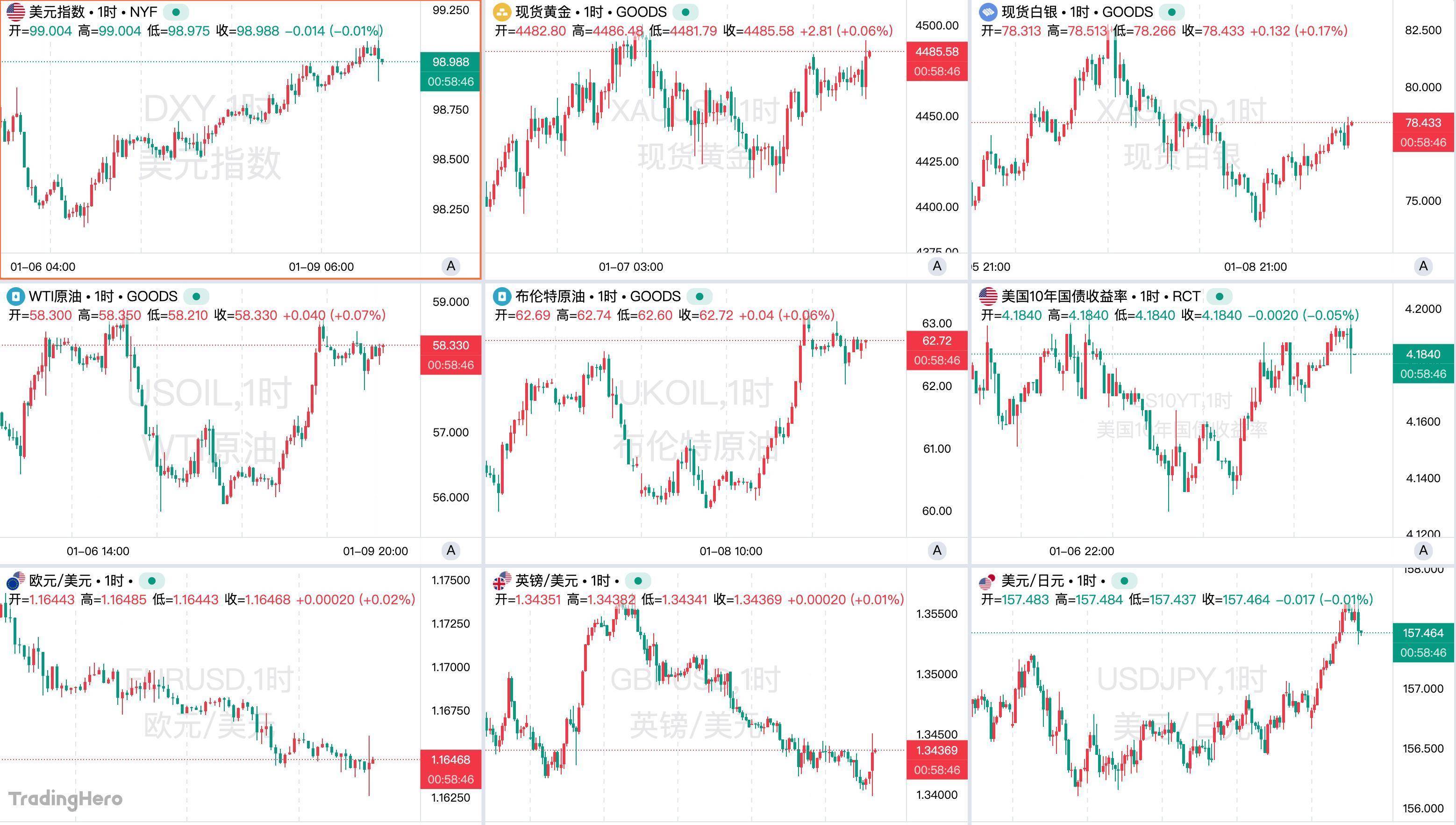 行情回顾美元指数本周整体走高,截至发稿实现四连涨,周五盘中重回99整数关口上方,为近一个月新高。美债收益率上行为美元提供利差支撑,同时避险情绪升温也推高了美元需求。周五数据显示美国失业率回落至4.4%,交易员认为1月降息大门已关闭。